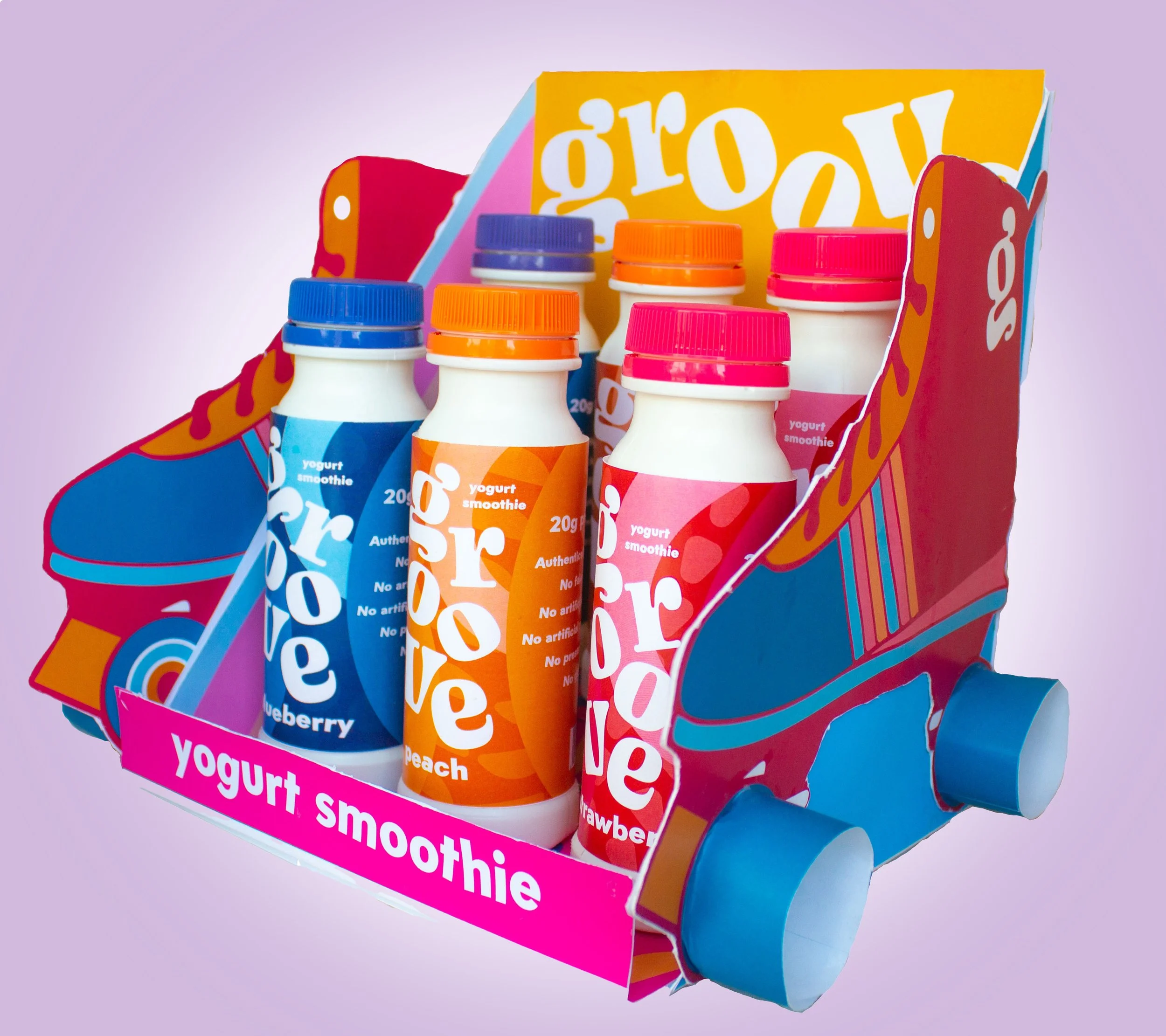 Groove is an organic yogurt smoothie brand aimed at busy young professionals looking for quick breakfast or snack options. I wanted to reflect the fun and energetic personality of the brand in the point of purchase display and bring to mind the idea of movement by using roller skates.