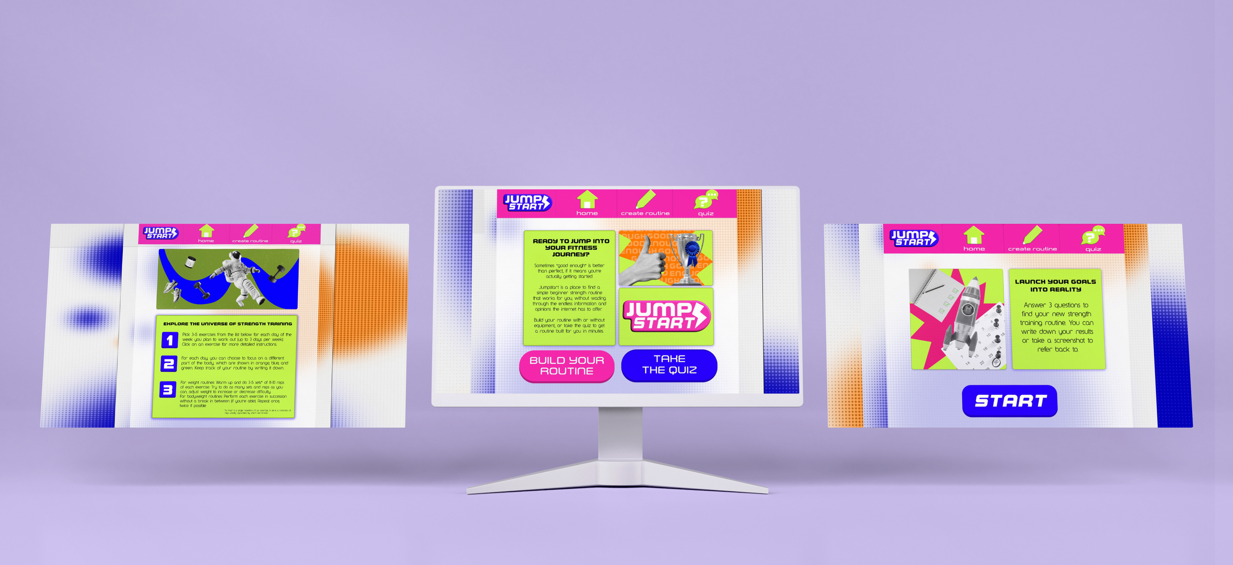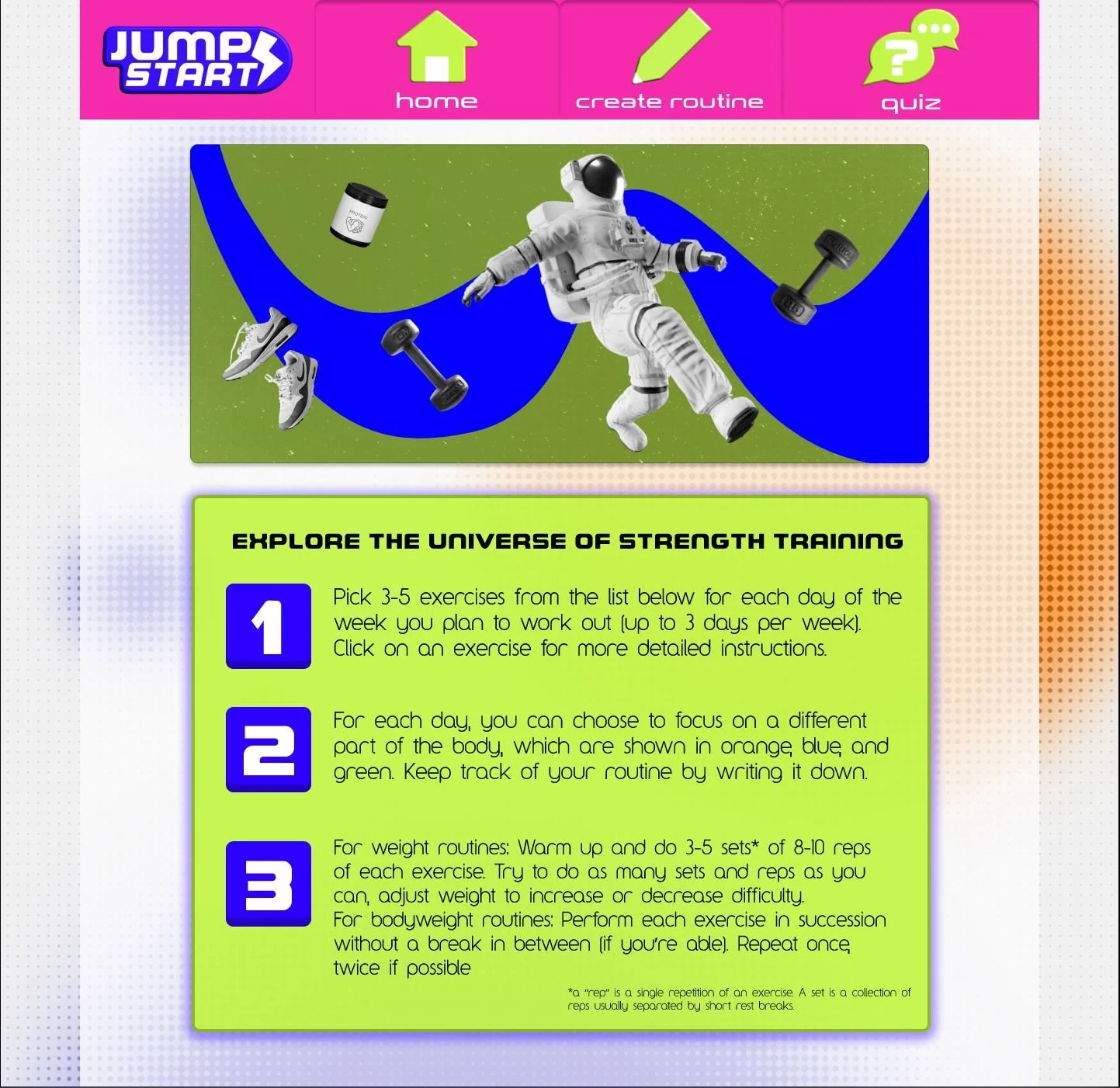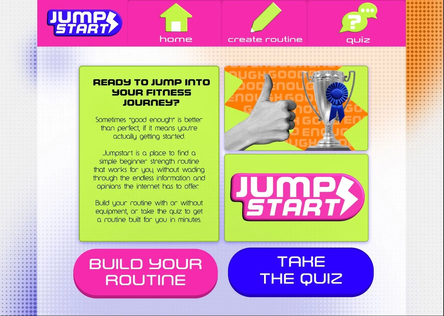 JUMPSTART is a website for fitness beginners to build their first strength routine, with or without access to gym equipment. The project focuses on simplicity and taking the first steps towards what you want to achieve, even if they’re small steps.