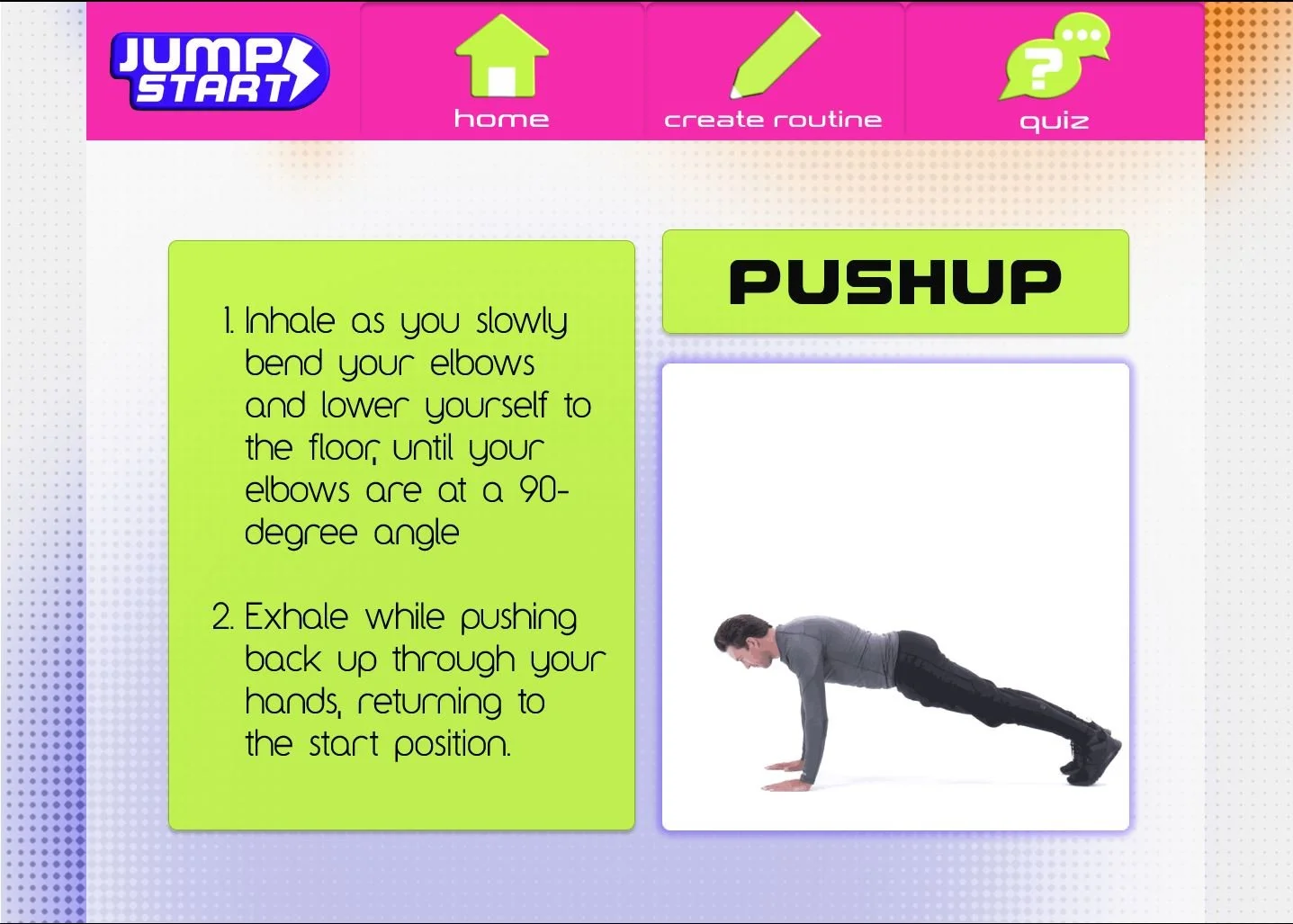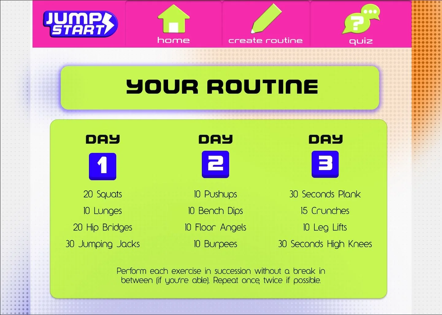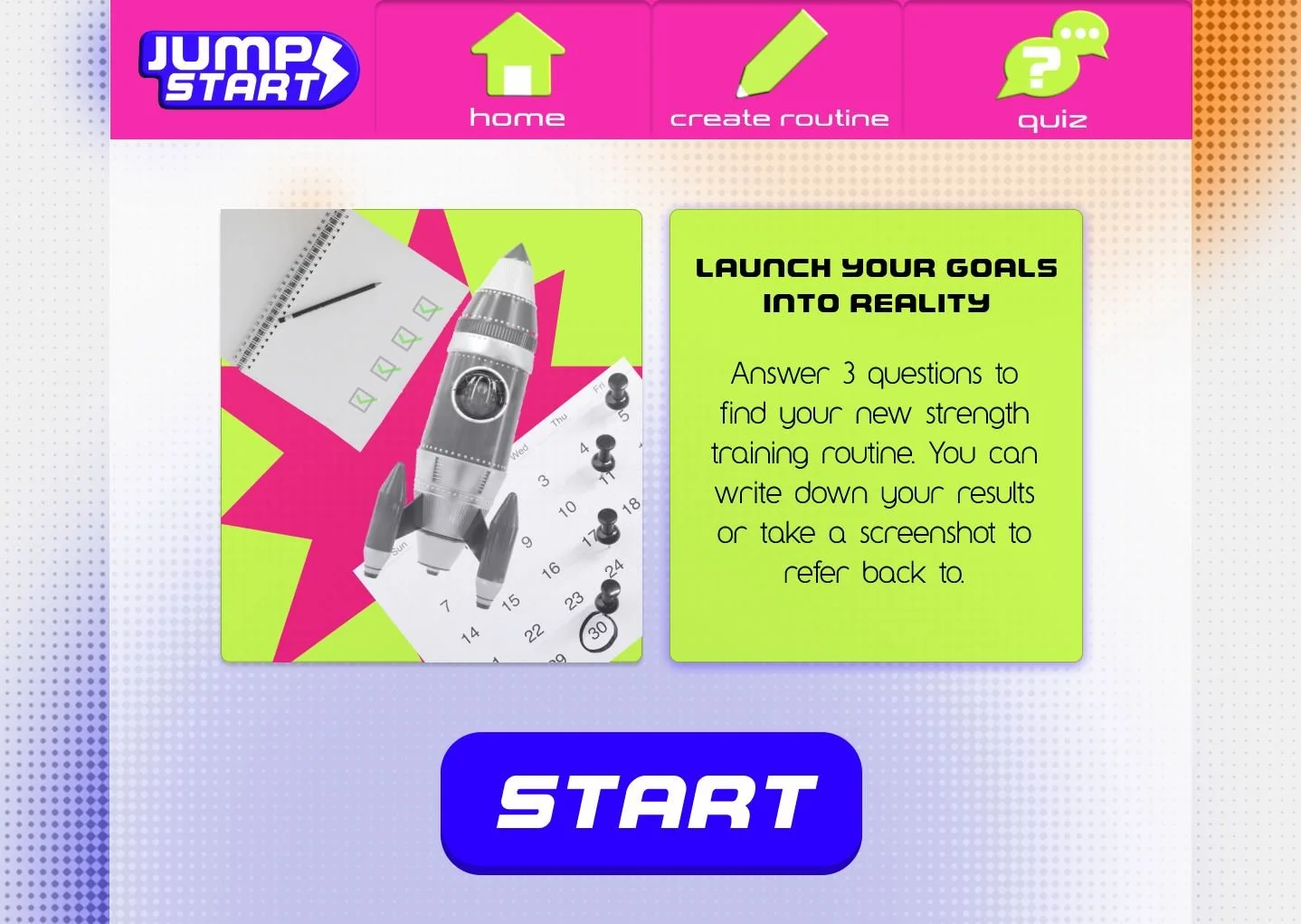 JUMPSTART is a website for fitness beginners to build their first strength routine, with or without access to gym equipment. The project focuses on simplicity and taking the first steps towards what you want to achieve, even if they’re small steps.